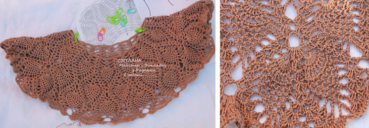 Основной сложностью при таком вязании является расчет количества от ряда к ряду для расширения полотна от горловины до края круглой кокетки.